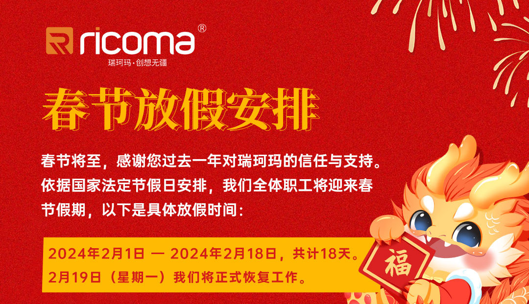 隨著春節(jié)的余韻漸漸散去,我們正式開啟了龍年的新篇章。瑞珂瑪全體員工從今日起恢復(fù)正常上班,我們將以飽滿的熱情,繼續(xù)為廣大新老客戶提供優(yōu)質(zhì)的產(chǎn)品與專業(yè)的服務(wù)!