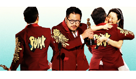 奧斯卡最佳導(dǎo)演關(guān)家永穿紅色西服,致敬片中楊紫瓊穿著。