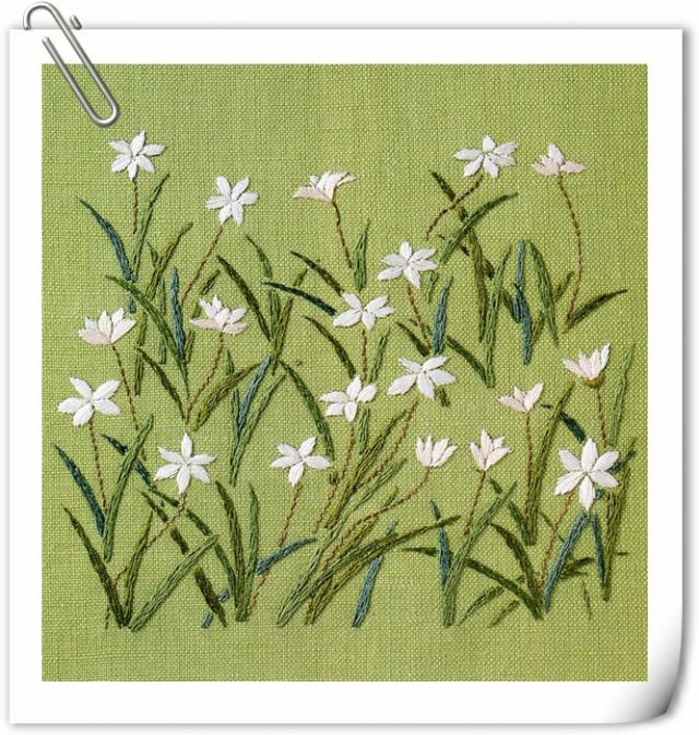 這種花兒叫韭菜蓮,每年六月到九月的時候就會開出很多很多潔白如玉的小花兒。把它繡在亞麻布上,是