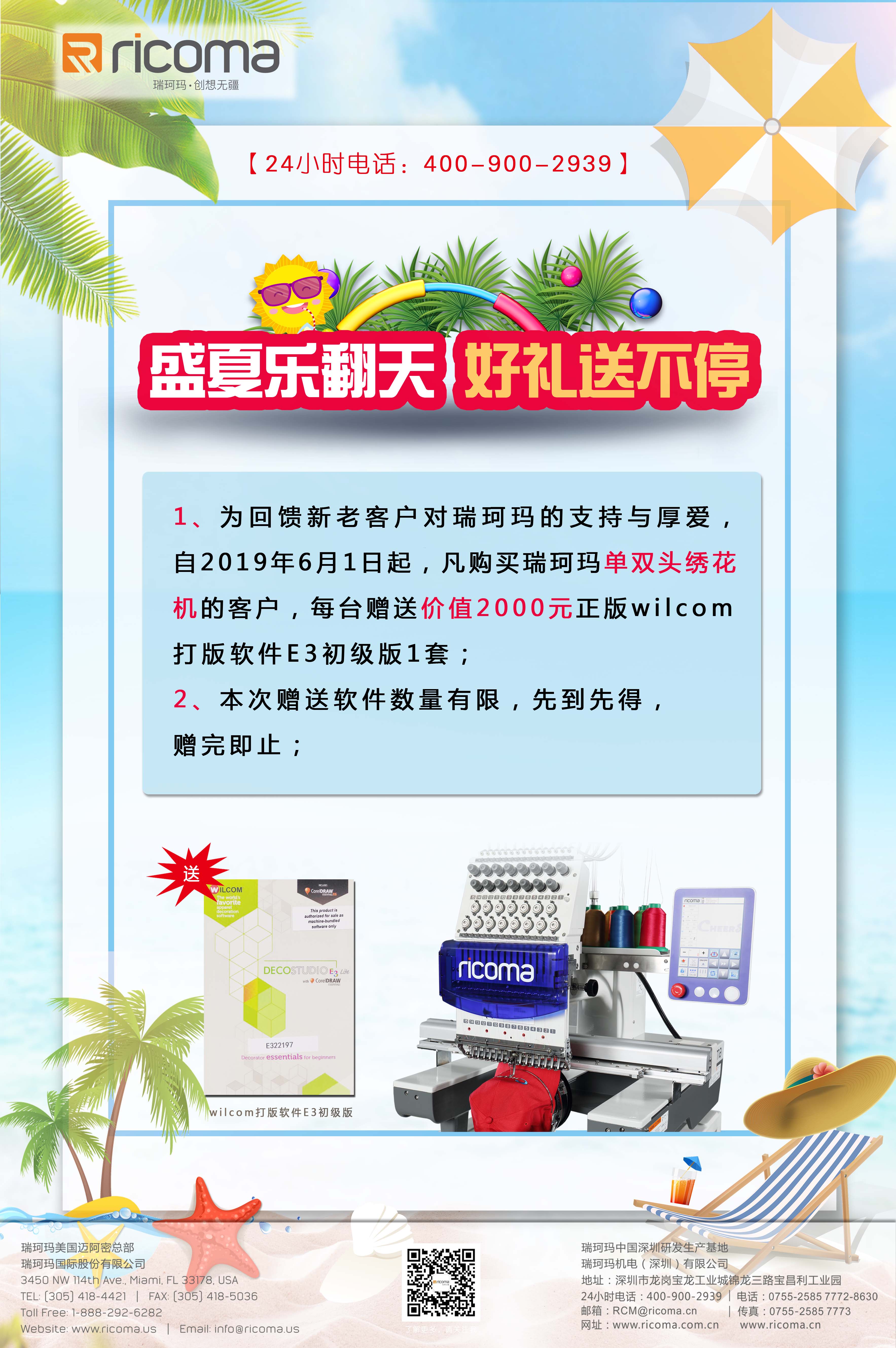 1、為回饋新老客戶對瑞珂瑪?shù)闹С峙c厚愛,自2019年6月1日起,凡購買瑞珂瑪單雙頭繡花機的客戶,每臺贈送價值2000