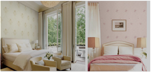 《御品》墻布系列經密針繡花和仿雙宮工藝織造,延續一貫“密、精、細”的作風,
