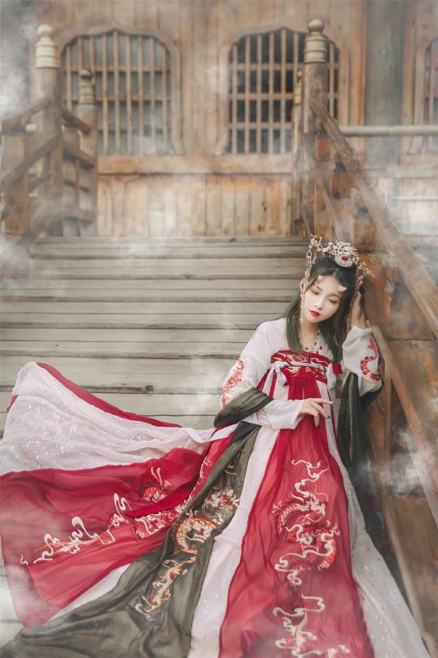 這款漢服重工龍身刺繡,整體造非常飄逸驚艷,它所有的刺繡都是跟龍相關(guān)。精美龍紋刺繡,