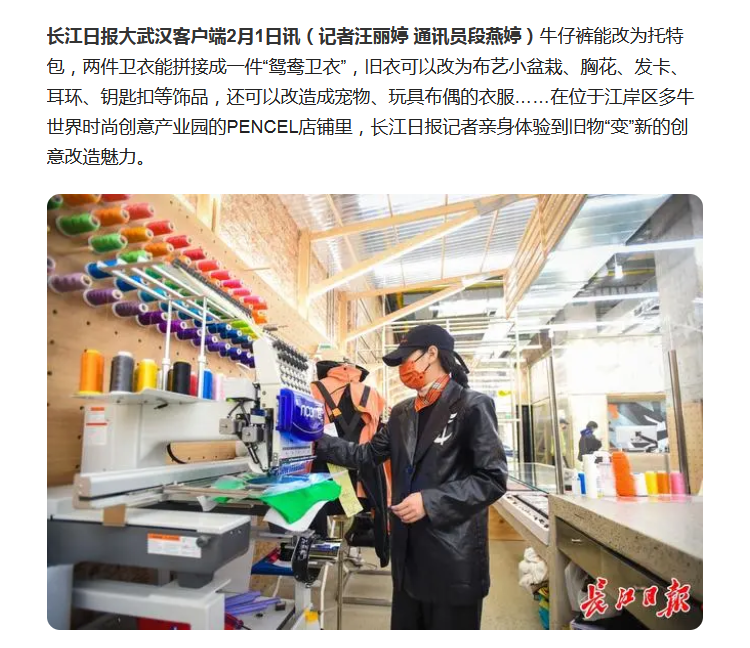 2月1日,長江日報對武漢潮牌店PENCEL進行了報道,對其通過服裝個性化定制方式實現文化及個性表達表示了贊許。在報道中瑞珂瑪繡花機赫然在目。